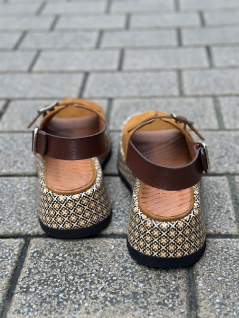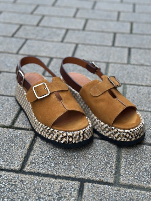 Confectionnées en cuir velours camel, elles se distinguent par leur plateforme originale à motif graphique noir camel et écru, apportant une touche moderne et sophistiquée. La bride arrière réglable en cuir grainé brun avec sa boucle assure un excellent maintien du pied, tandis que la semelle intérieure en cuir garantit un confort optimal, même lors d’une utilisation prolongée.