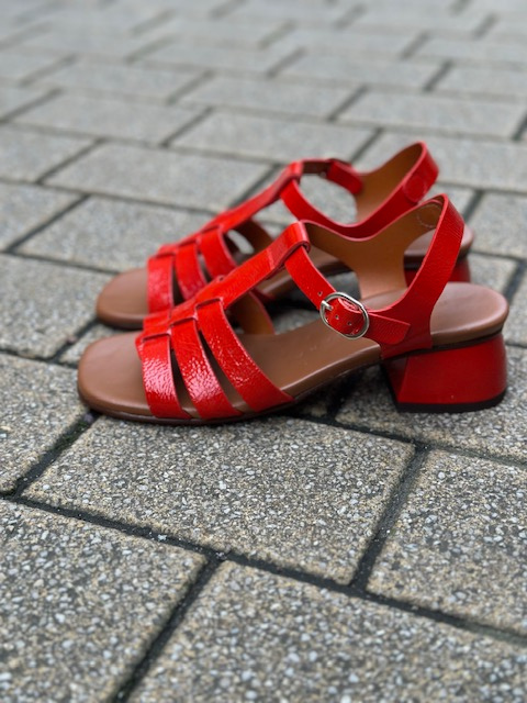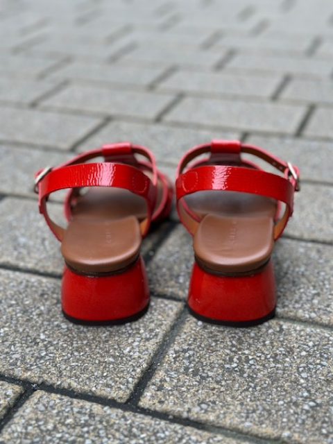 La sandale à brides avec son talon trotteur est un modèle confortable. Le cuir vernis souple d’une souplesse exceptionnelle est décliné sur une teinte rouge orangé. Le talon, recouvert de cette même peau, assure une continuité visuelle raffinée.