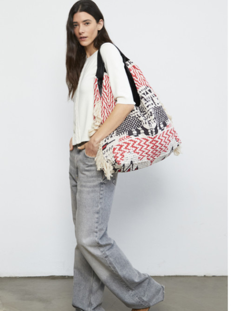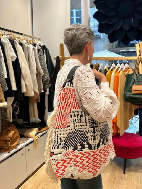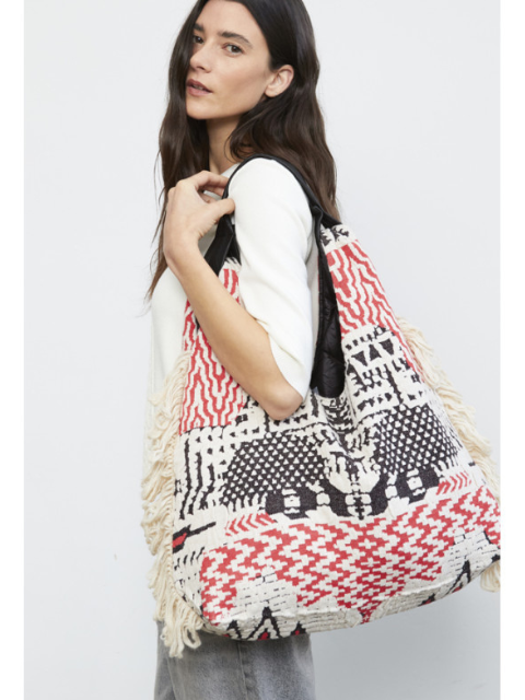 Ce grand sac à l’esprit bohème chic se distingue par son motif jacquard graphique et sa texture riche, réalisée dans un mélange noble de laine mérinos (55%), d’acrylique (34%), de polyamide (9%) et de lycra (2%).
