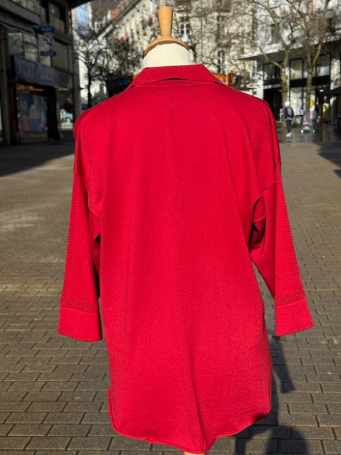 Ce pull rouge carmin col polo, encolure V est élégant et facile à porter, il séduit par son équilibre parfait entre confort et raffinement. Confectionné dans un mélange délicat de 85 % coton et 15 % cachemire, il offre une matière souple, respirante et subtilement douce sur la peau. On aime sa double longueur avec un bel arrondi dans le dos. Les manches 3/4 sont délicatement ajourées.