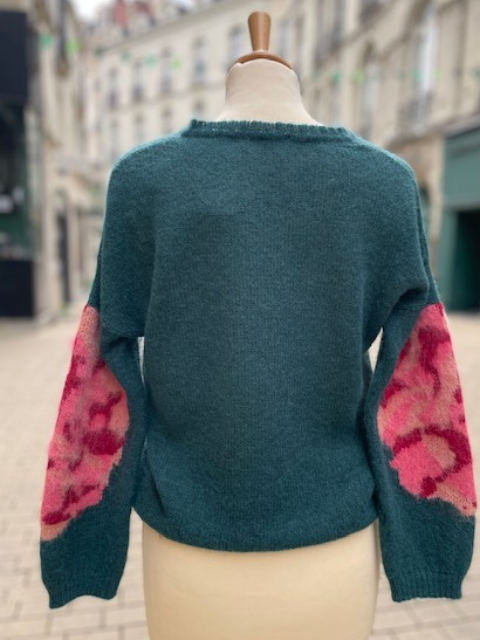 Ce modèle se distingue par ses manches originales ornées de superbes coudières aux motifs floraux bordeaux et roses, véritables œuvres d’art en tricot qui illuminent toute la silhouette. Ces coudières apportent une note artistique et contemporaine, faisant de ce pull une pièce unique, idéale pour sublimer vos tenues du quotidien comme vos looks plus sophistiqués.