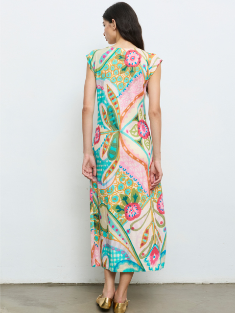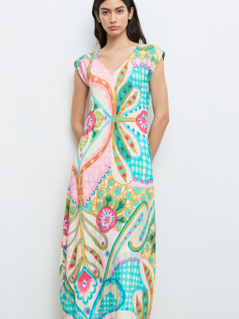 Robe longue Aldo Martins au style bohème-chic, avec un imprimé multicolore très lumineux (motifs floraux & graphiques). Sa coupe fluide et confortable en fait une pièce idéale pour l’été, les vacances ou une occasion spéciale.
