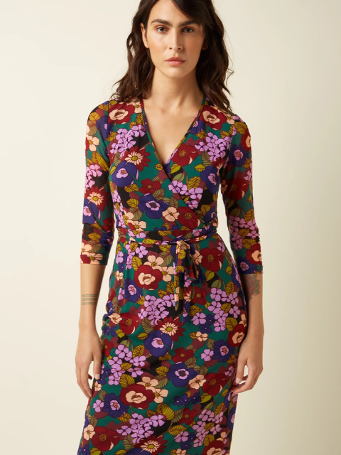 La robe King Louie Anja est une véritable célébration de la féminité et du style rétro. Sa coupe portefeuille flatte toutes les silhouettes, tandis que son imprimé floral aux couleurs vibrantes illumine votre garde-robe de saison. Les manches trois-quarts apportent une touche raffinée, idéale pour la mi-saison, et la ceinture à nouer souligne la taille pour un look sophistiqué et naturel.