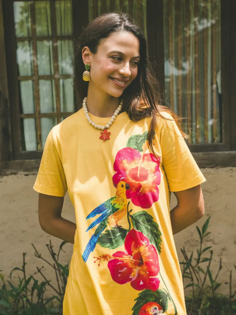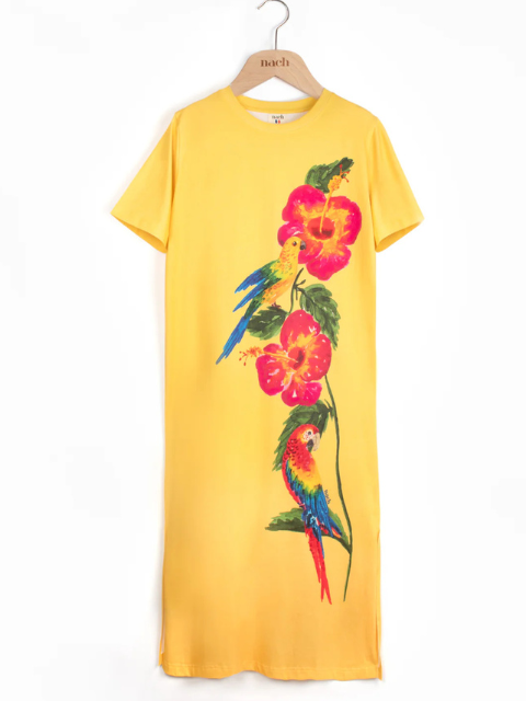 Motif : Imaginé et dessiné à la main par Nancy, co-créatrice de Nach, ce design met en scène des perroquets et des hibiscus. Une composition graphique affirmée, à porter comme une œuvre d’art. Imprimé placé.
