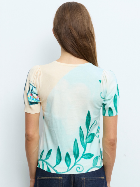 Imprimé façon aquarelle avec fenêtre stylisée et fleurs colorées, complété par des motifs végétaux sur les manches et le bas du corps.