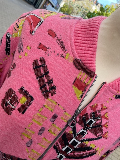 Sur un fond rose intense, les motifs dansent tels des mosaïques contemporaines, conférant à ce modèle une allure à la fois artistique et intemporelle. Sa coupe décontractée, son col côtelé et ses manches légèrement bouffantes en font un compagnon idéal pour affirmer votre style avec confiance et originalité.