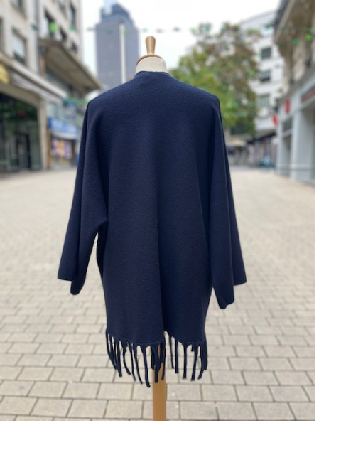 Confectionnée dans un tissu doux et souple, elle vous accompagnera aussi bien en superposition sur une tenue d’intérieur qu’en veste légère pour les soirées d’automne ou de printemps. Son design épuré est rehaussé par une frange subtile à la base, qui apporte une touche bohème tout en mouvement.